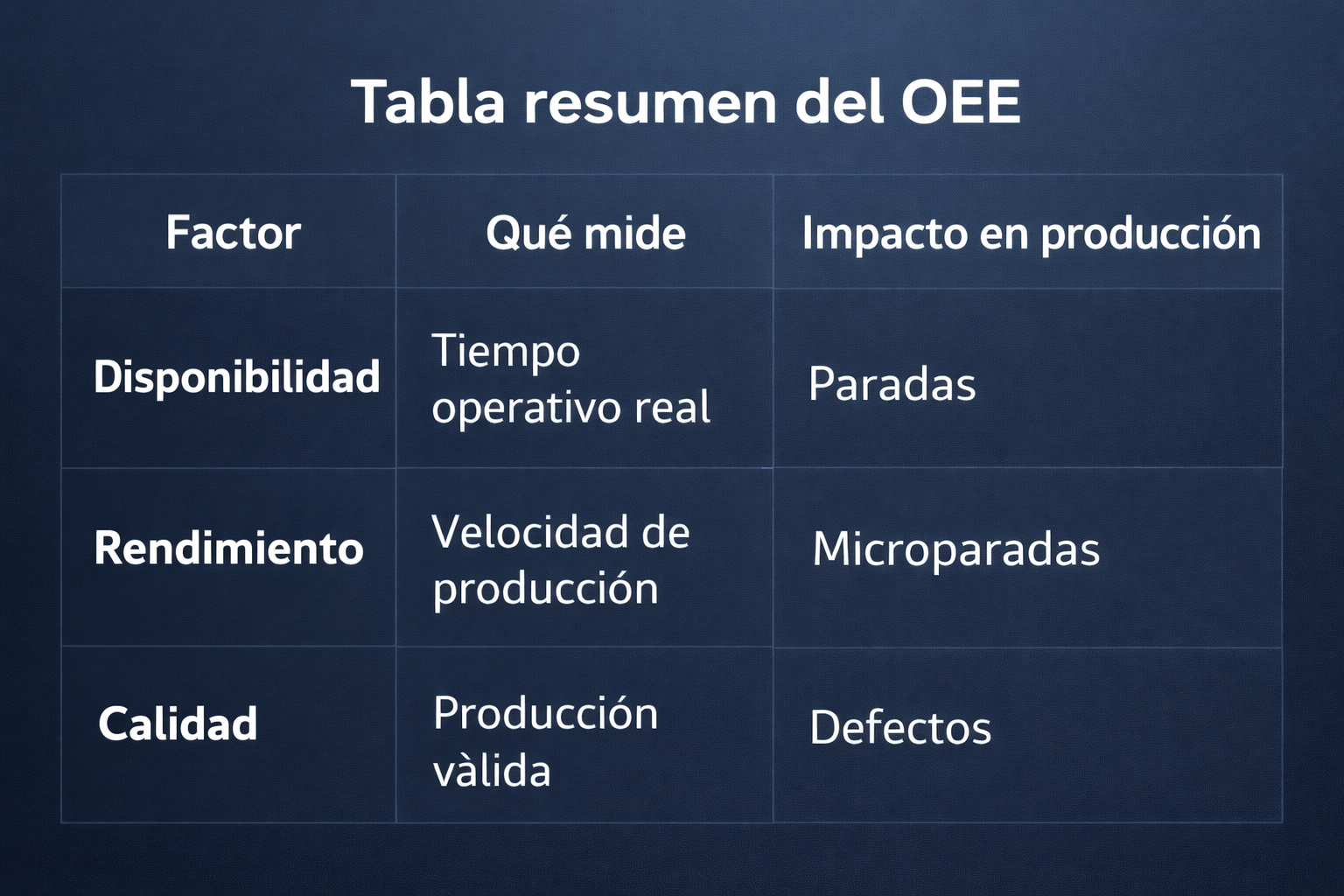 El OEE mide la eficiencia real de un equipo o línea de producción.